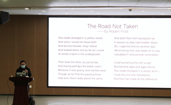 会议伊始,王俊老师以“The Road Not Taken”的诗句为引,分别举出五个学长学姐的例子,以视频的方式展现出各自的经历、现在的生活以及未来计划,切身处地地引导同学们做出适合自己的选择。此外,王俊老师以开头的诗作结,勉励同学们要提升自我,走好自己选择的路。
