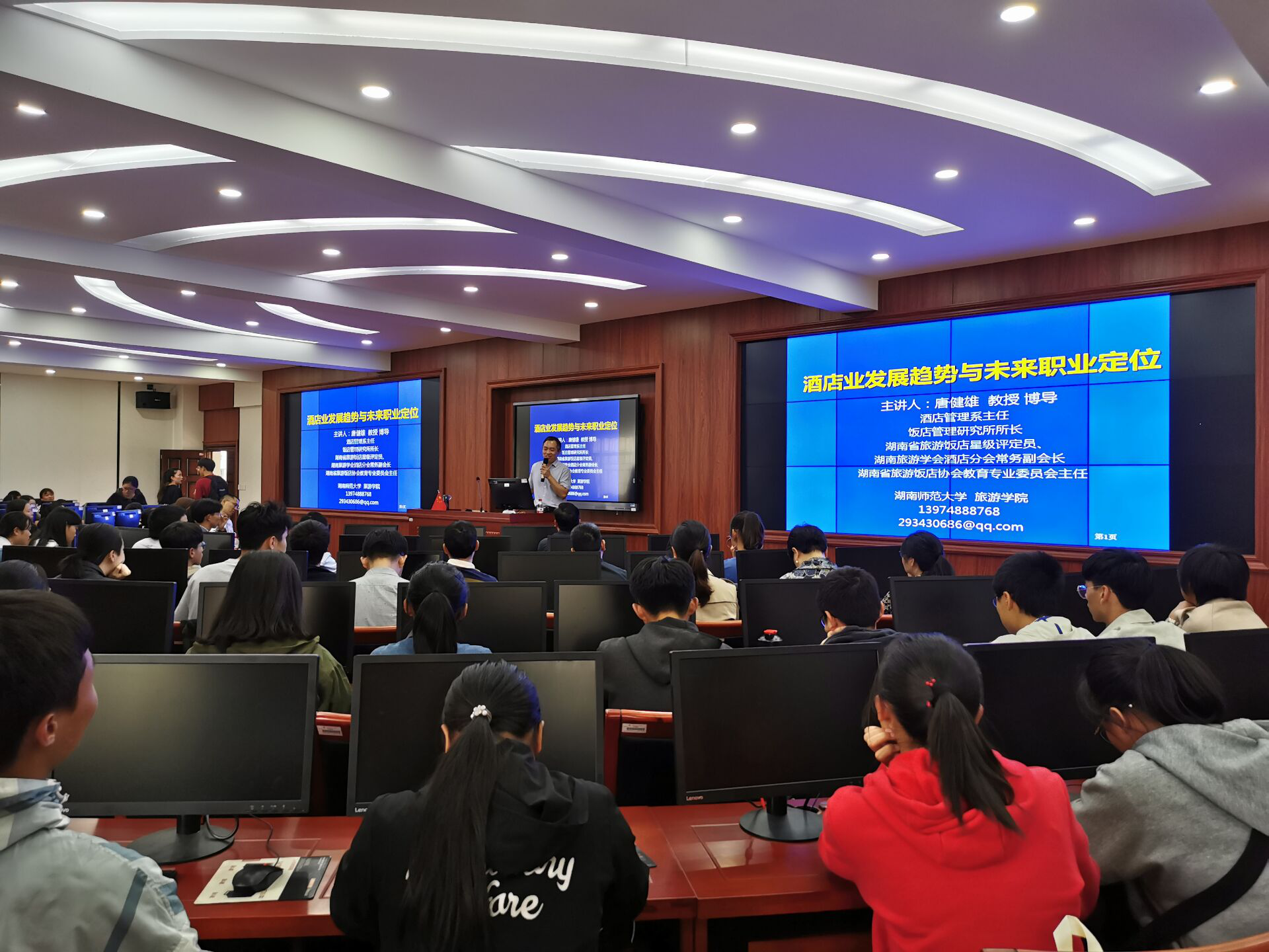 10月22日下午,beats365官方网站邀请到了湖南师范大学的唐健雄教授做了“酒店发展趋势与未来职业定位”的专题讲座,公司党总支书记王淑霞、副书记刘敬龙,旅游管理教研室主任、硕士生导师刘飞龙及旅游管理教研室的其他老师们到场,与全体2018级旅游管理专业的同学共同聆听本次讲座。