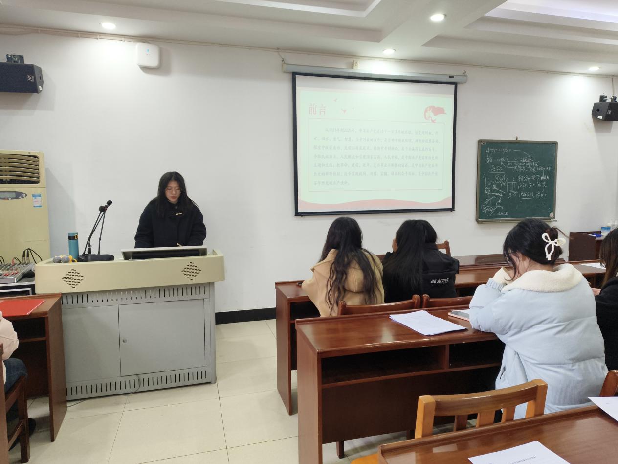 会议伊始,徐璐同学以回顾中国共产党发展历程的重要节点引出中国共产党的精神谱系与初心使命,强调新时代党员要牢记初心与使命,通过党员的自我革命践行“两个维护”,为实现中华民族伟大复兴贡献力量,展现党员担当。