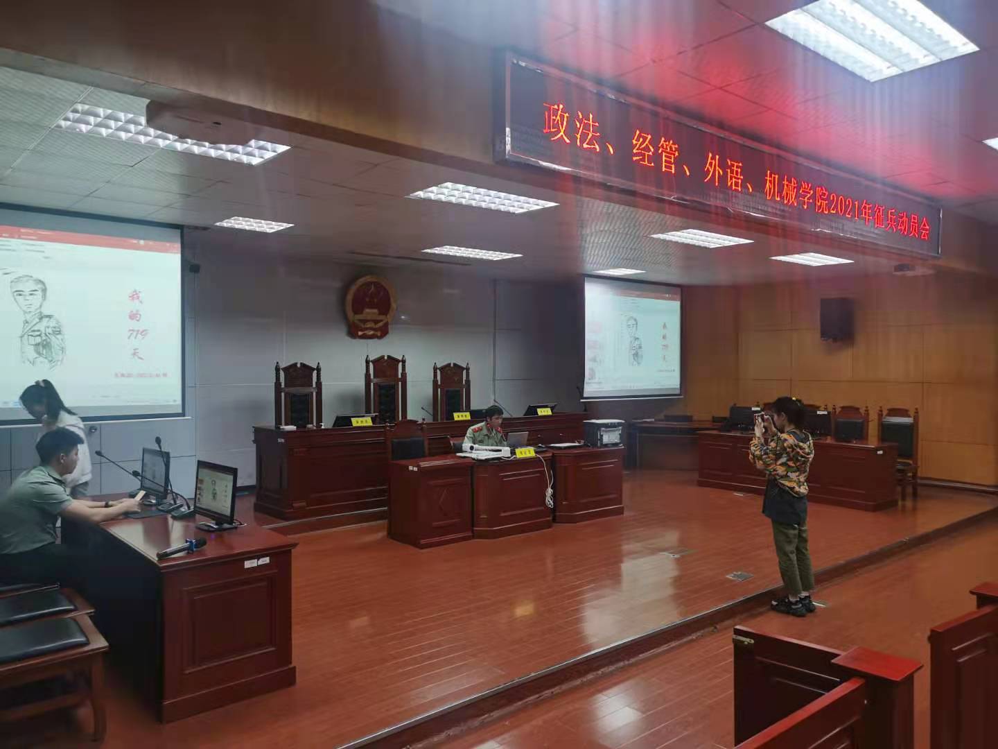 会上,还通过腾讯会议连线了政法、机械、信息公司的3名现役士兵,他们主要讲述了自己的任务,通过镜头为同学们展示了真实的部队生活,不仅使同学们近距离感受军营生活,也激励了同学们当兵的热情。