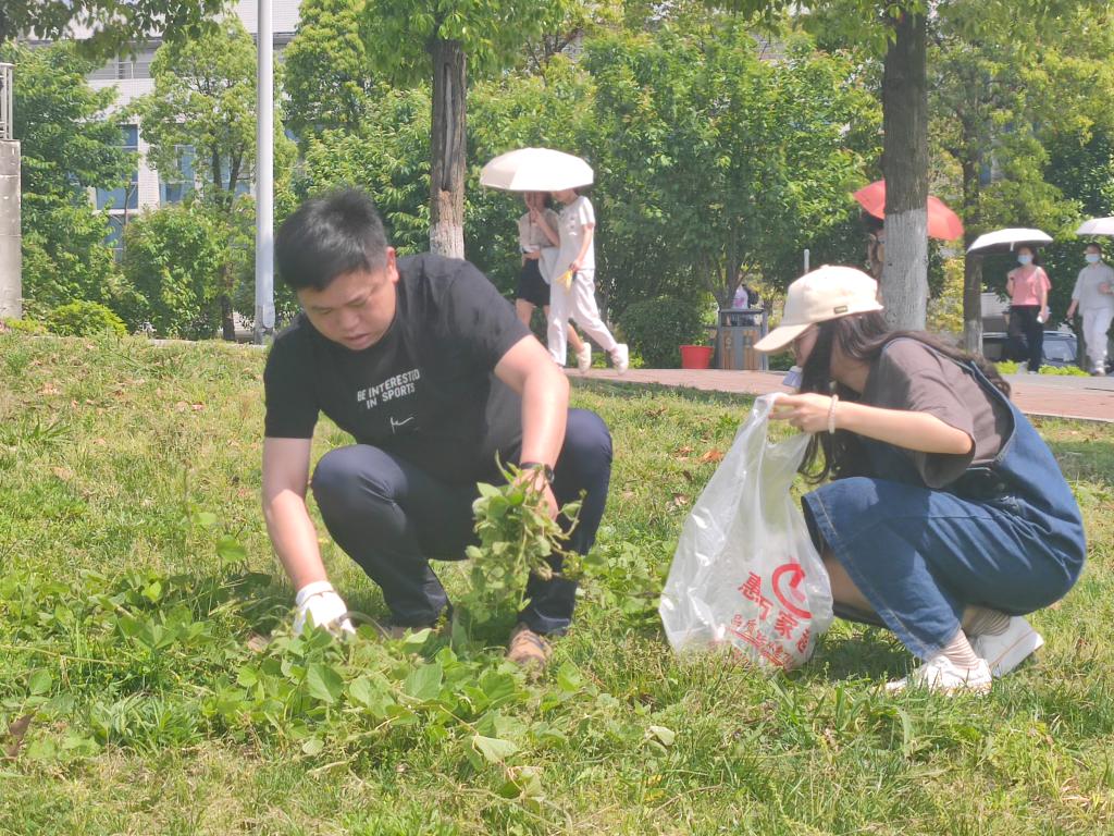 在公司的安排下,同学们有条不紊地开始了阳光大草坪、图书馆周边道路的卫生清扫工作。由于春季草木茂盛,阳光大草坪的除草工作任务较重,公司党委书记刘思超、辅导员易萧老师便亲自拿着镰刀、手套等工具,带领同学们将杂草、枯草进行了集中清除。锄杂草、拾垃圾、搬枯枝,师生们纷纷发扬不怕苦、不怕累的精神,分工协作,干劲十足,为共建美丽和谐校园贡献出自己的一份力。