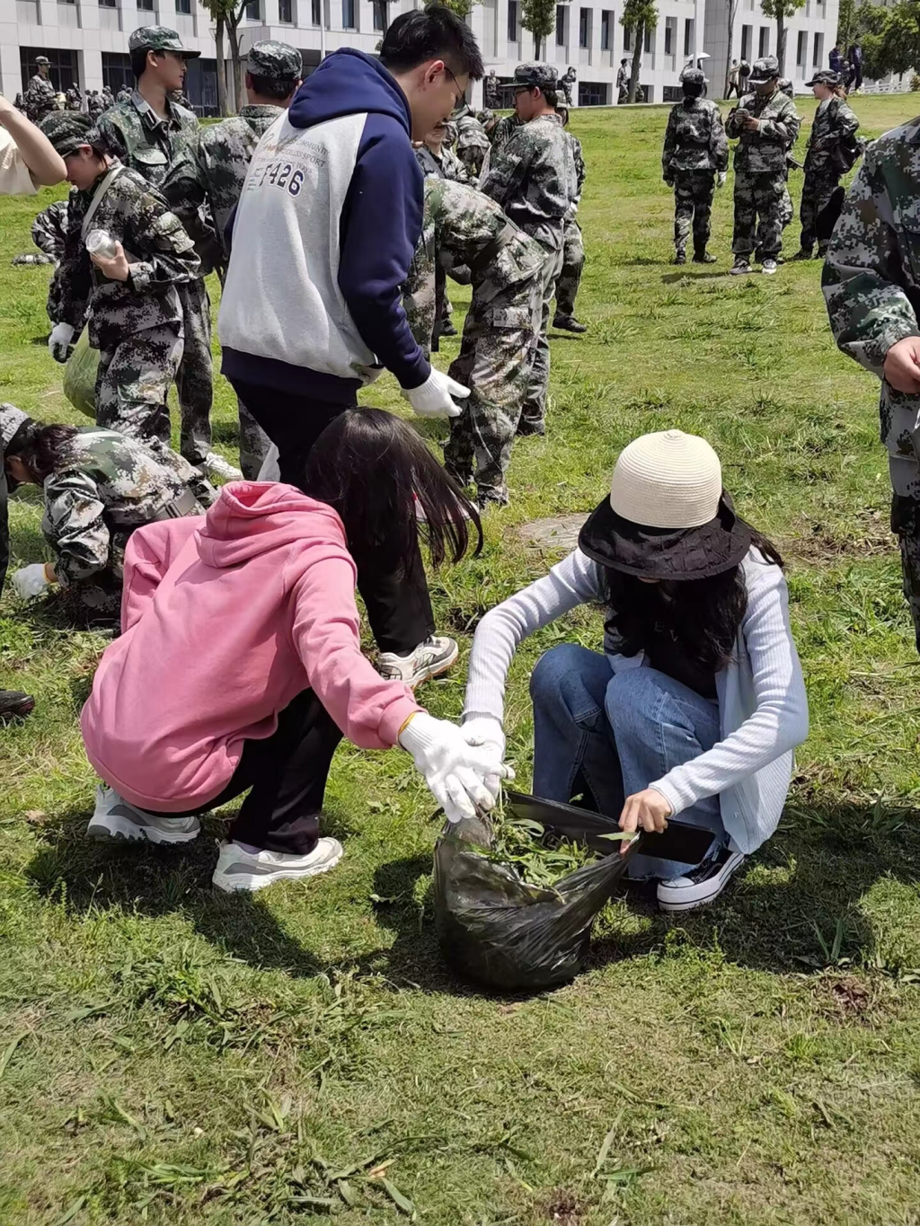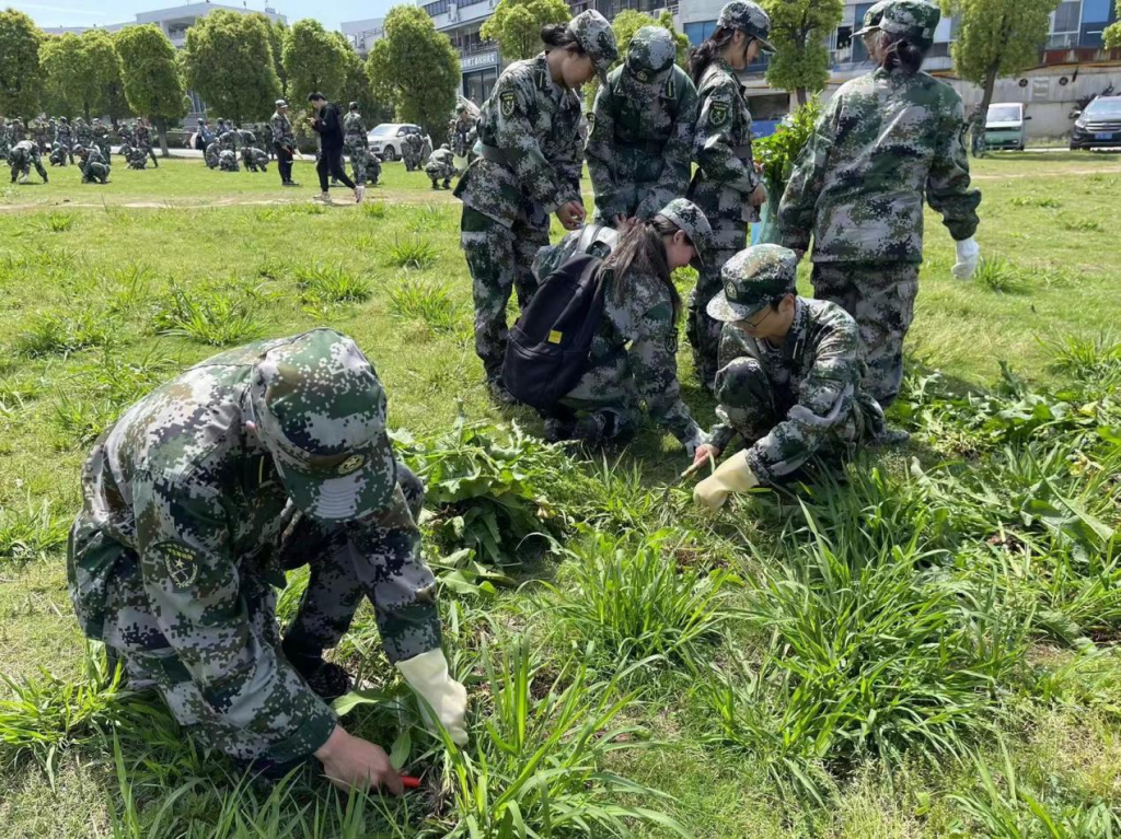 此次活动开展在军训期间,在活动中,新生们多以连或排为单位相互合作。一部分同学用镰刀挖除杂草,整平土壤;其他同学一手戴手套,一手拿着垃圾袋,将大草坪上的烟头、包装袋等生活垃圾捡拾干净。大家齐心协力,分工协作,虽然累得满头大汗,但看到干净整洁的草坪都露出了微笑,感受到了劳动教育带来的快乐。