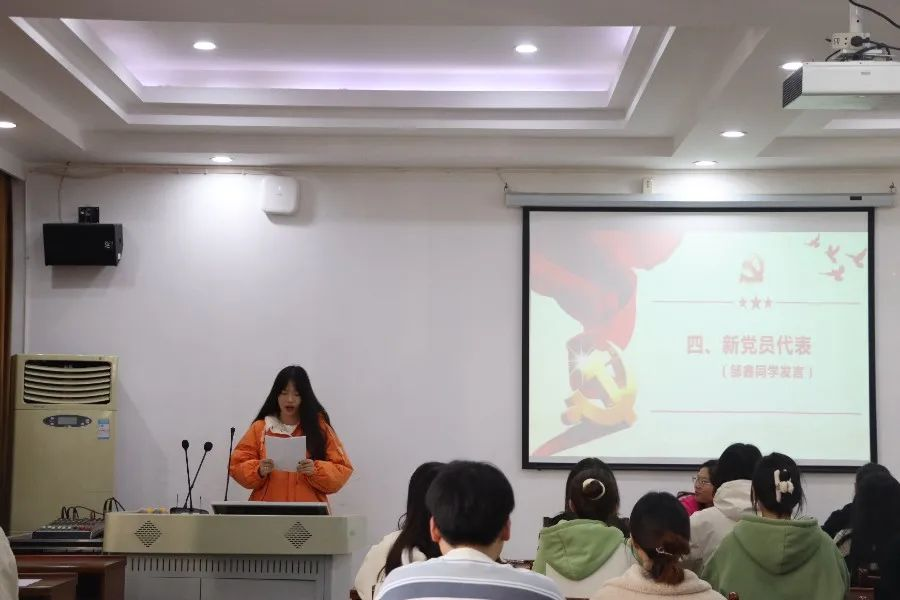 会议由新党员代表邹鑫同志发言,提出了自己的决心:牢记党的宗旨,把有限的生命投入到无限的为人民服务中去,在党组织中发挥党员的先锋模范作用,在关键时刻挺身而出不断加强自身道德修养,尊重领导,团结同学,自觉同一切违法犯罪行为作坚决斗争。代表的发言中充满了坚定地信念与责任担当,她表示将以更加积极的姿态投身到党的事业中,努力奋斗无私奉献。