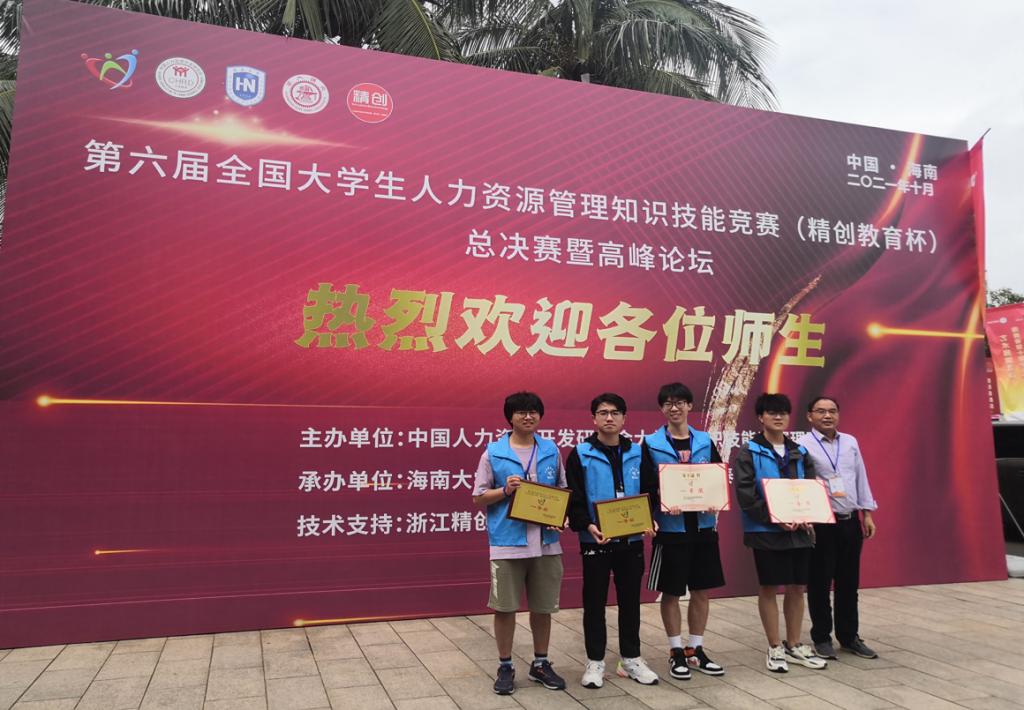 10月24日,第六届全国老员工人力资源管理知识技能竞赛(精创教育杯)总决赛暨高峰论坛在海南大学落下帷幕。在本次知识技能竞赛中,由经过重重入围,最终荣获总决赛一等奖。经过激烈角逐,beats365官方网站专任老师易翠枝、彭十一指导的人力资源管理专业本科生王家旭、董过同学、秦桢同学、罗发佳同学组成的代表队荣获全国一等奖。