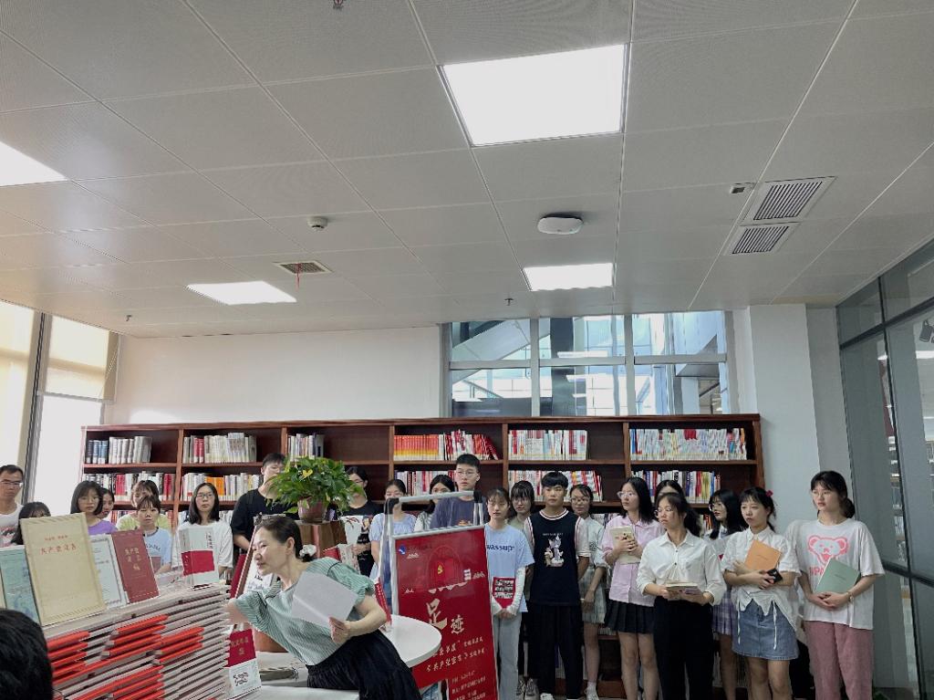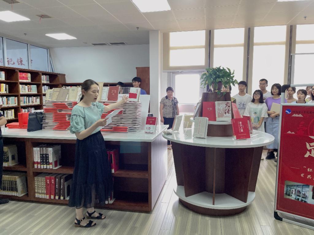 “红色书屋”里,书柜上陈列的各类红色书籍深深吸引了公司党员师生们的目光。图书馆馆员叶海燕老师为师生们介绍了“足迹”主题展中馆藏的不同年代历史版本的《共产党宣言》,以此激励全体师生党员能追随“真理的足迹”,做《共产党宣言》的忠实传人。随后,叶老师还为大家推荐了同时展出的其他“红色精神”文献。其中,今年“一校一书”的精读书《火种:寻找中国复兴之路》、《文献中的百年党史》等优秀作品,对于同学们了解党史、树立坚定理想信念有重要启发意义。此外,大家还了解到,本学期图书馆还将推出“党建连心”服务,预约开放图书馆五楼“红色书屋”党建活动室,为全校师生的党建活动提供场地。