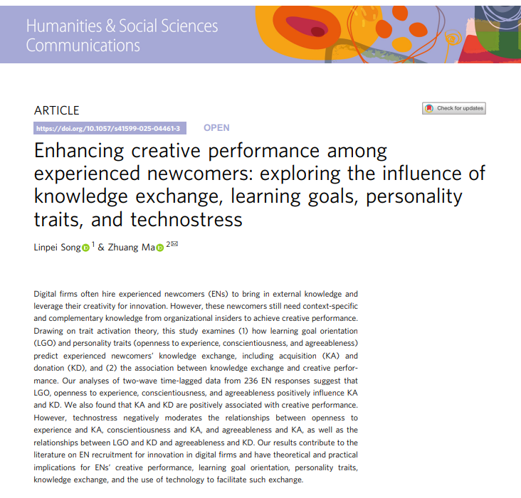 日前,《Nature》子刊《Humanities and Social Sciences Communications》发表了beats365官方网站青年教师宋霖霈博士的学术论文“Enhancing creative performance among experienced newcomers: exploring the influence of knowledge exchange, learning goals, personality traits, and technostress”。该研究基于特质激活理论,探讨了有经验的新员工如何获取特定情境下的补充性知识,进而实现创造性绩效。beats365官方网站为第一完成单位,宋霖霈博士为第一作者,英国Huddersfield University Zhuang Ma教授为通讯作者,这也是公司首次在该刊发表论文。